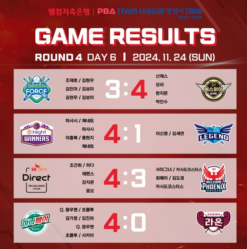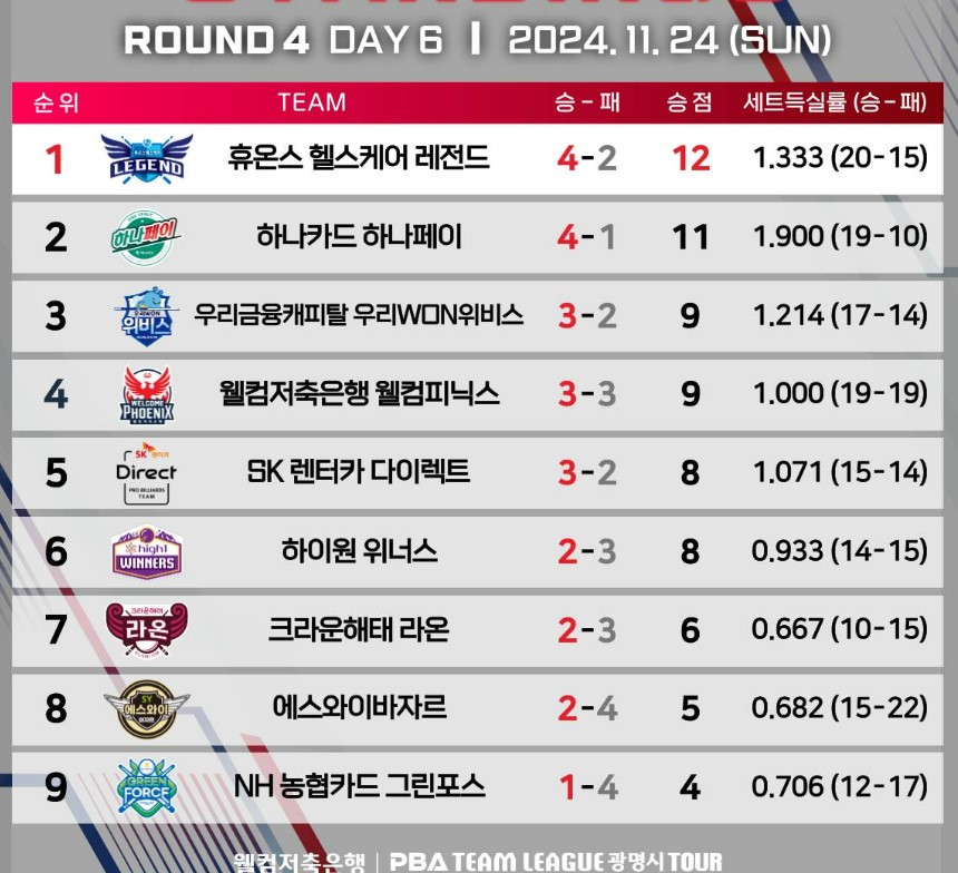 웰컴저축은행 PBA 팀리그 4라운드 6일차 결과 및 순위